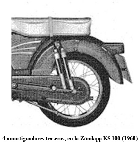 Montaje de 2 amortiguadores traseros a cada lado. Hasta el momento (octubre / 2025) fue el modelo KS 100 de ZÜNDAPP la única que los montaron de fábrica...