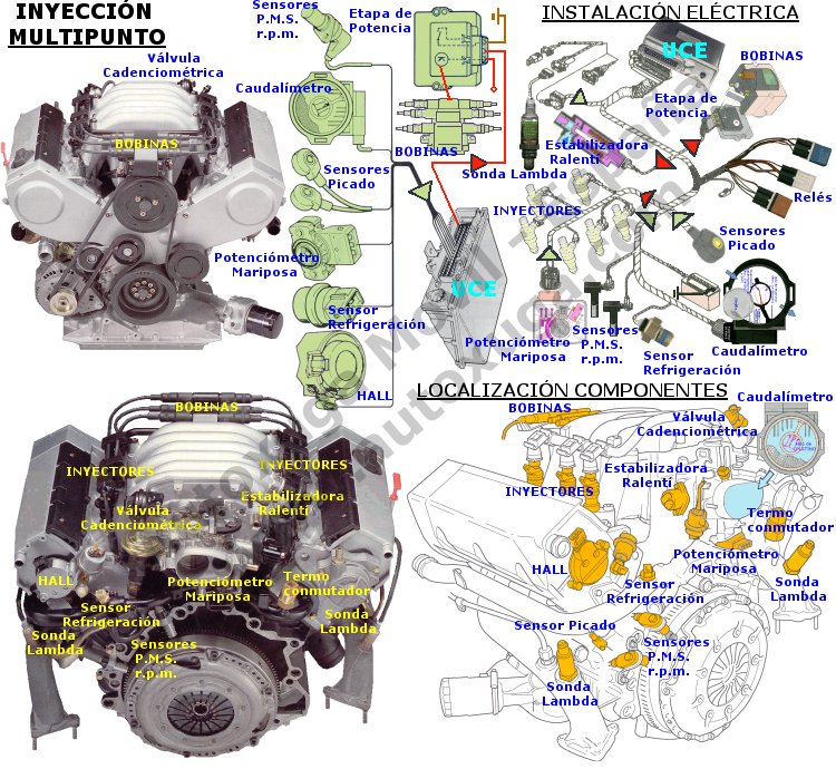 La inyección multipunto es un subtipo de EFI. Cada cilindro tiene su propio inyector, colocado cerca de la válvula de admisión, mejorando la precisión y la eficiencia frente a la inyección monopunto (un solo inyector para todos los cilindros).