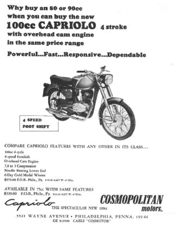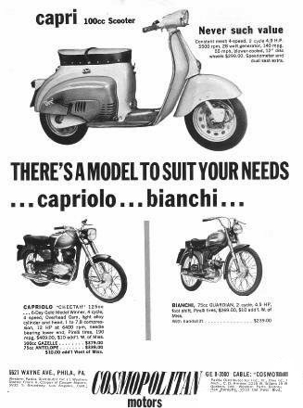 Cosmopolitan Motors fue uno de los importadores más importantes de motos italianas en EE. UU., y sus ciclomotores Cosmo son hoy piezas de colección.