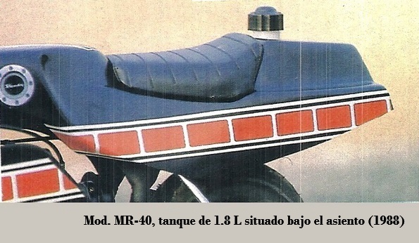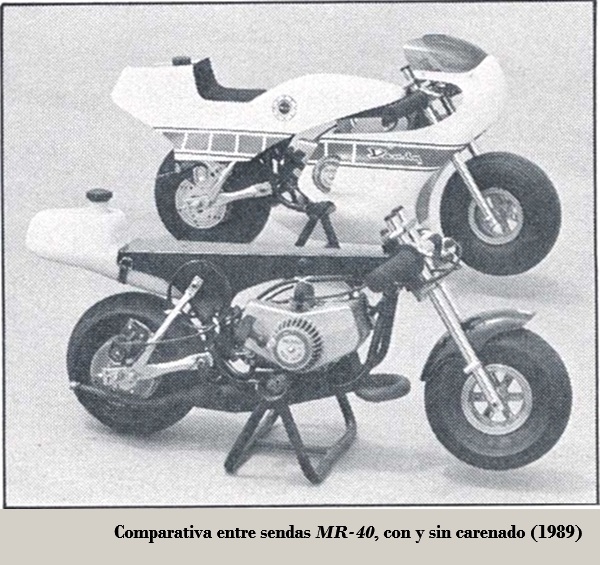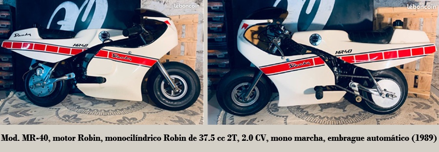 • MR-40: motor Robin EY37 / EY40 de 37.5 c/c, 2.0 CV / 8 500 rpm con más par, mayor velocidad 40 mph (64.4 km/h) o 70 km/h con kit de preparación tanque de combustible bajo el asiento (por encima de la rueda trasera), neumáticos más gruesos, algunos también con freno de disco delantero (al equipar kit para competición), bastidor más rígido (más puntos de soldadura), batalla 990 mm y con un peso prácticamente igual; en version con carenado (que al igual que la carrocería era de FRP, y sin él.