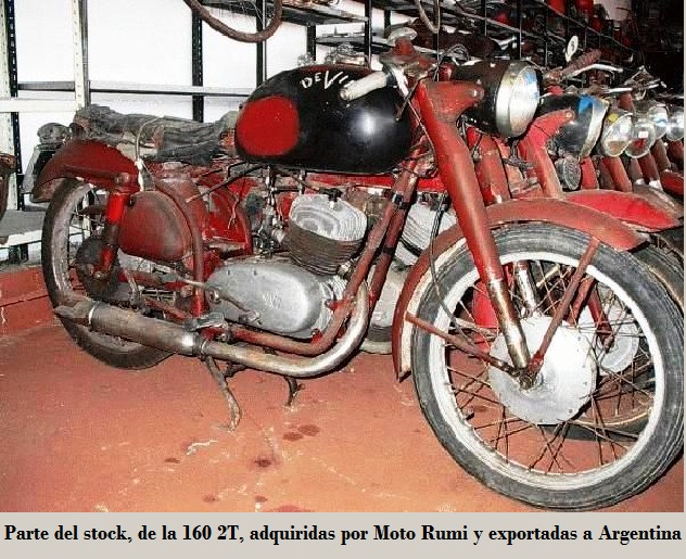 La firma se clausuró en 1957, y en el proceso de liquidación se vendieron 2.000 unidades del modelo 160 de 2T, que permanecían como stock en el almacén que poseían en Bergamo siendo adquiridas por MOTO RUMI que exportó a la Argentina con su logo en el tanque de combustible y en la tapa del cárter...