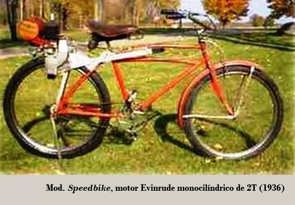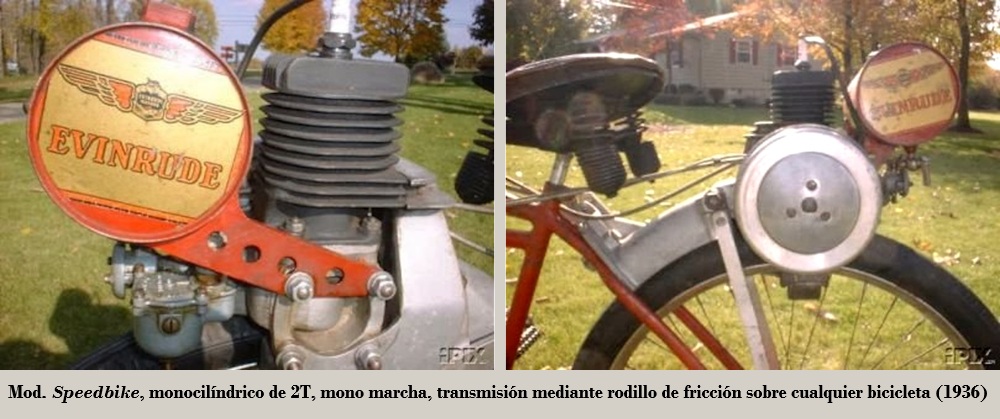 El que fuera famoso fabricante "Evinrude Outboards Motors", fundado en 1907, por Ole Evinrude, con sede en la pequeña población de Sturtevant, Wisconsin, como fabricante de motores náuticos fuera bordo, durante los años 1936 y 1937, produjeron motores auxiliares para ser montados en bicicletas convencionales, montados sobre la rueda trasera, con transmisión por rodillo de fricción. Al vehículo se le denominó Evinrude Speedbike
