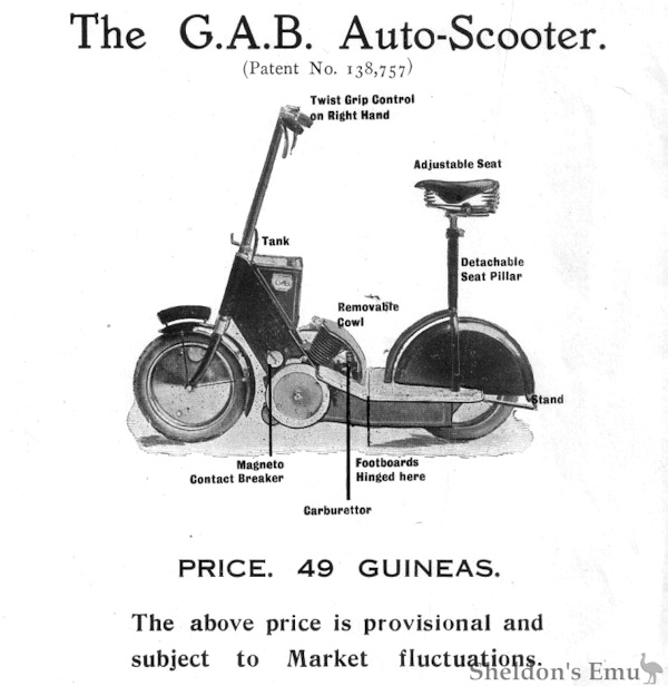 Finalizada la I Guerra Mundial hubo un auge en la producción de escúteres. En 1919, el GAB fue un intento pero de corta duración para sacar provecho de la moda.