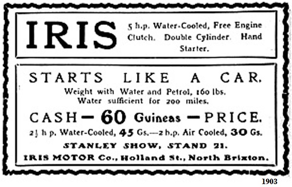 La firma "Iris Motor Co.", con sede en Holland Street, barrio de Brixton, de la población de Lambeth, condado de Londres, fabricó motocicletas - muy vanguardistas - desde 1902 hasta 1904.