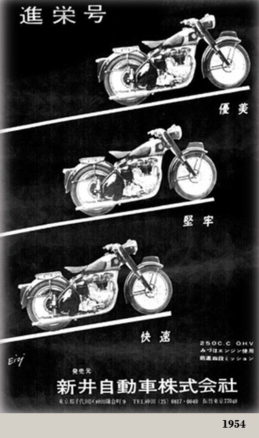 En 1953, apareció una motocicleta ligera, bajo el nombre de Teriya (テリヤ号) equipada con motor monocilíndrico de 88 cc, y un año más tarde lanzó la Shinei (進栄号), una monocilíndrica de 250 cc 4T con distribuciòn ohv, monobloque de 4 velocidades, transmisión P/S por cadenas}, {bastidor doble cuna}, suspensión D/T horquilla telescópica / émbolos, frenos de tambor D/T.