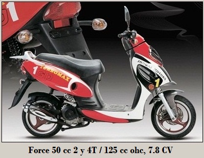 - Force (YY50QT-21): de 50 cc de 2T y 4T ohc, 4.0 CV / 8 000 rpm, frenos D/T disco / tambor, neumáticos D/T 120 - 70-12" / 130 - 70-12", velocidad 70 km/h, tanque de combustible 4.20 L y 90 kg de peso.