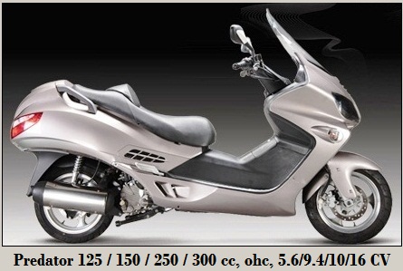 - Predator (YY300T): de 300 cc, 16 CV / 7 000 rpm, velocidad 130 km/h; resto igual versiones anteriores.