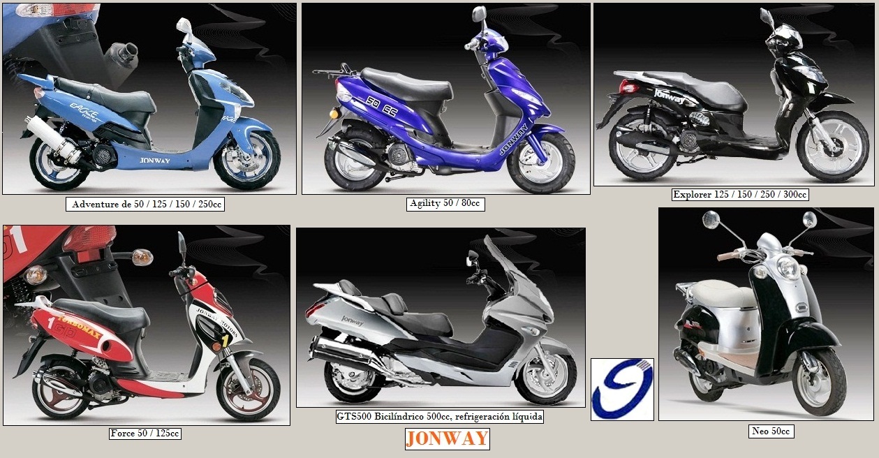 - Agility (YY50QT-6): de 50 cc de 2T y 4T ohc, 4.0 CV / 8 000 rpm, neumáticos D/T 3.50 x 10, velocidad máxima 70 km/h, tanque 4.40 L y 84 kg de peso.