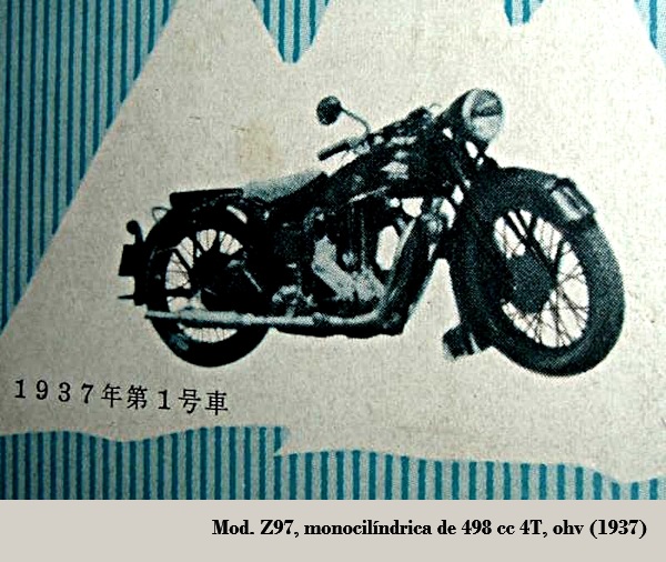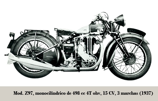 - Z97, fue la primera motocicleta fabricada: monocilindrica de 498 cc, 15 CV, 3 marchas, suspensión D/T horquilla de paralelogramos con resorte central / rígida y ~ 150 kg; fue la base de los modelos SG y T1; 1937-1938.