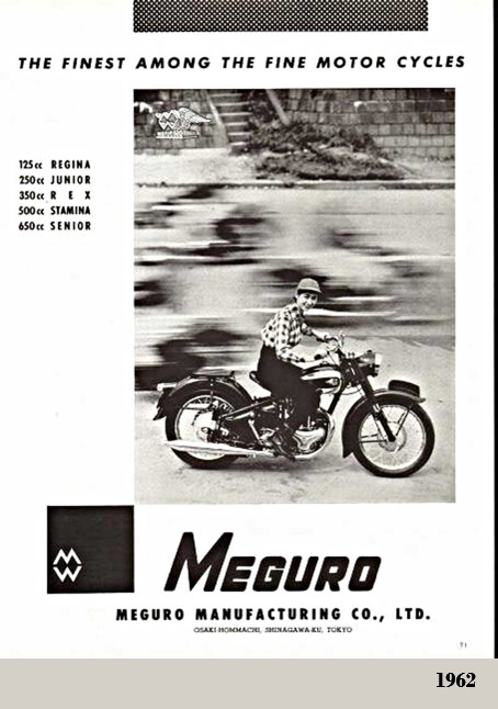 MEGURO, fue una de las grandes marcas japonesas de motocicletas hasta que fue absorbidas por KAWASAKI (1964) pasando entonces a fabricarlas, sobre todo monocilíndricas con cilindradas de 124 a 498 cc. esta última también podía ser bicilíndrica; en aquel entonces todas fueron réplicas de las británicas.
