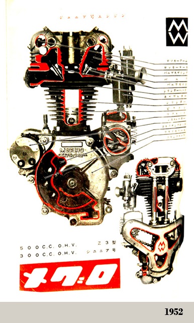 Terminado el conflicto, MEGURO, continuo su política de fabricar modelos, pero de estilo británico, bien monocilíndricos ohv, bien bicilíndricos paralelos desde 248 hasta 651 cc también ohv, este último copia evidente de la BSA A-10.