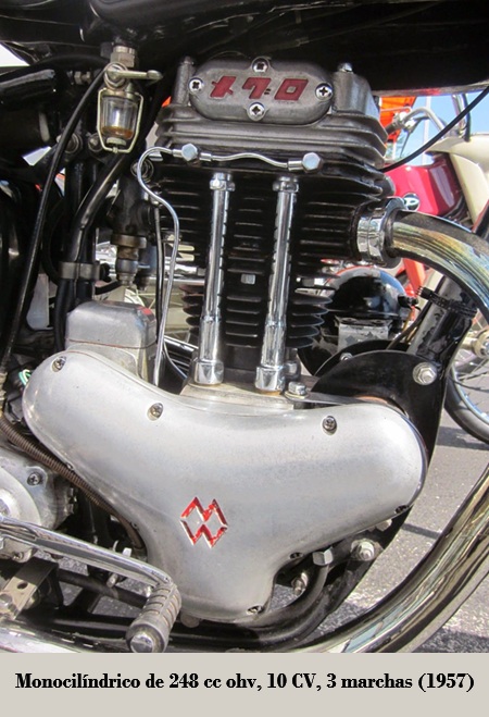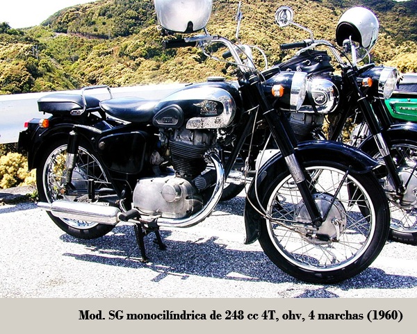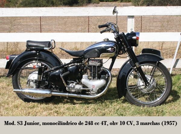 - S3 Junior: de 248 cc, 10 CV / 4 000 rpm, 3 marchas, transmisión final por cadena, batería de 6V, suspensión D/T horquilla telescópica / émbolos, frenos de tambor D/T, llantas D/T 19”, batalla 1435 mm, velocidad máxima 97 km/h y 161 kg. 1950-1958
