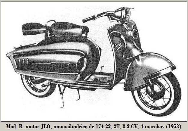 - Mod. B: de 173.47 cc, 8.2 CV, 4 marchas, neumáticos D/T 3.0.12", velocidad máxima 85 km/h, tanque 5.0 L (consumo de 2.8 L/100 km) y 85 kg de peso. Producción 100 unidades. 1950-1953
