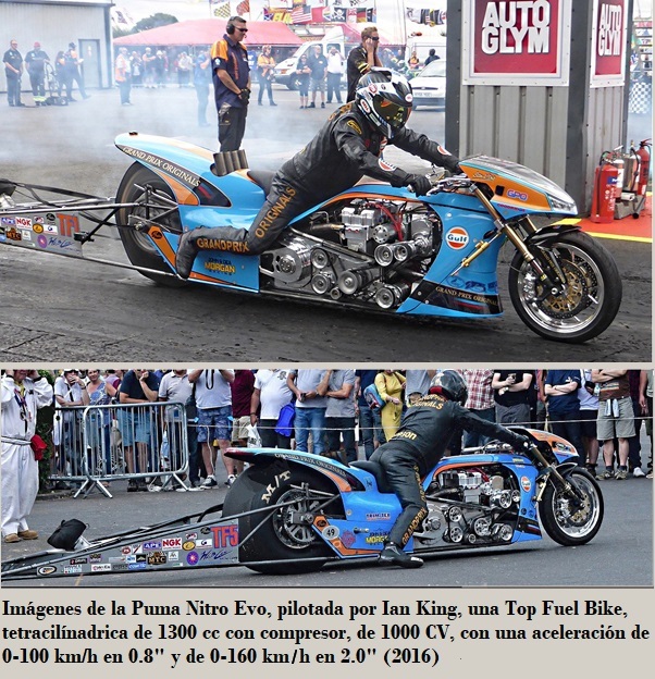 • Nitro EVO, tetracilíndrico 1300 cc compresor, 1000 CV 0-100 km/h en 0.8 segundos, 0-160 km/h en 2 segundos velocidad máxima 400 km/h, pilotado por el británico Ian King