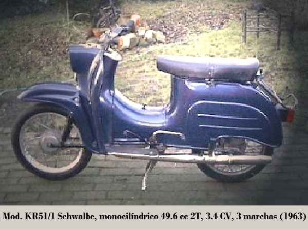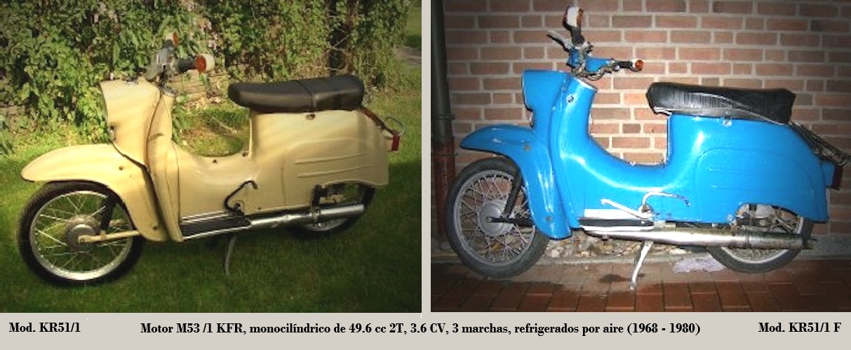 - KR51/1: motor M53/1KH, 3.6 CV / 5 700 rpm, 3 marchas, velocidad máxima 60 km/h y 80 kg ; producción 350.000 u. 1968-1980