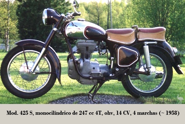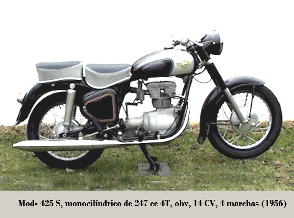• 425 S: monocilíndrica de 247 cc 4T, distribución ohv, 14 CV / 6 300 rpm, monobloque de 4 marchas, transmisión por eje, bastidor doble cuna, suspensión D/T horquilla telescópica / basculante con amortiguadores de {embolo} - posteriormente con amortiguadores hidráulicos- frenos de tambor D/T, velocidad máxima 110 km/h y 156 kg; producción 84.000 unidades. 1955-1961