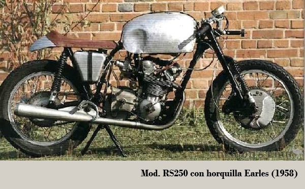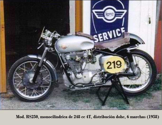 • RS250 Racer: de 248 cc dohc, 6 marchas, bastidor doble cuna, frenos de tambor D/T {doble leva} el delantero y en versiones con horquilla {Earles} o bien estándar. 1956-1958