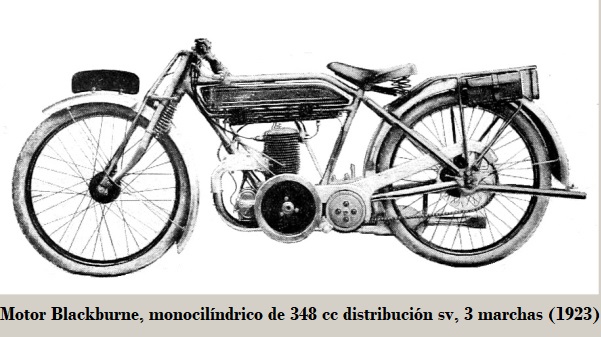 Equipada con motor BLACKBURNE monocilíndrico de 348 cc sv, de 3 velocidades, horquillas Druid, transmisión P/S cadenas, magneto BTH, volante motor externo y carburador Amac.
