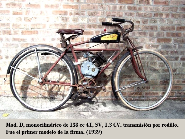El primer motor Whizzer fue el D. Se trataba de un monocilíndrico de 4T, de 1.37 CV, refrigerado por aire y un tanque de combustible de 3.0 L; producción / venta alrededor de 1.000 unidades.