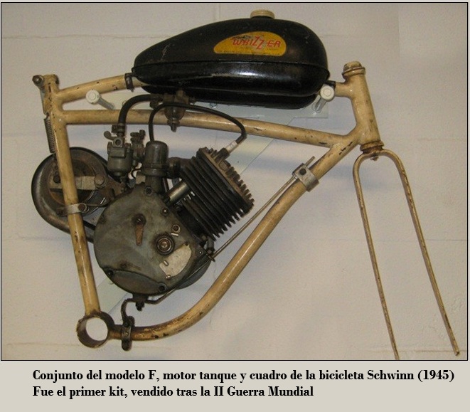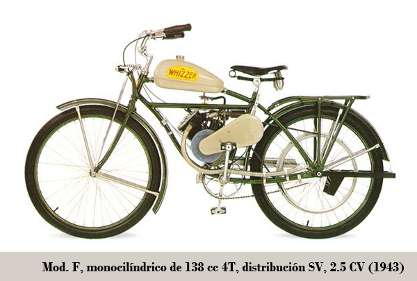 • En 1945, finalizada la contienda, WHIZZER fue capaz de llevar su producción de motores y ponerlos a disposición del público en general. El modelo F, lanzado eses año fue el mismo que el fabricado durante el período bélico, con transmisión por correa y el tanque de combustible de mayor tamaño; aproximadamente fabricaron / vendieron 4.200 unidades.