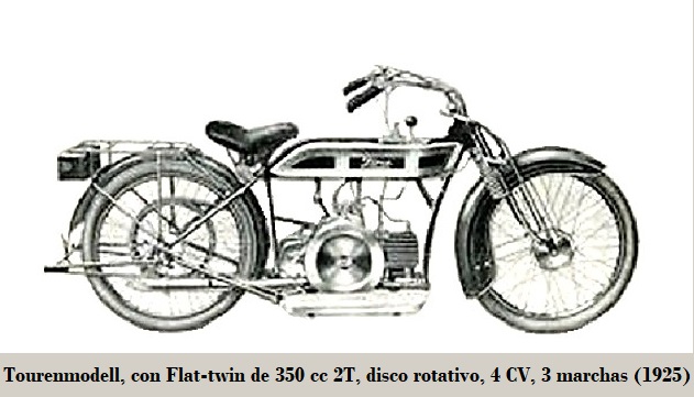 • Tourenmodell 25, Flat-twin longitudinal en versiones de 1.95 / 4.43 CV, transmisión P/S por cadenas.