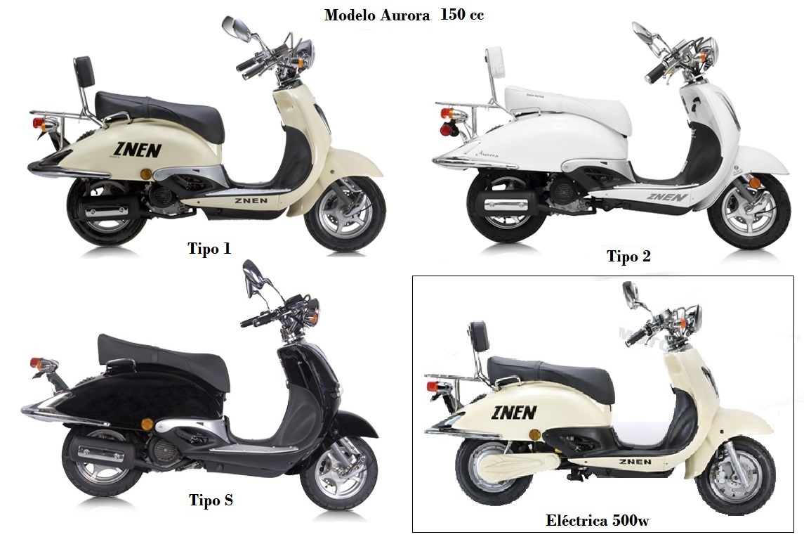 • Aurora: de 124.6 cc, 7.6 CV / 7 500 rpm, neumáticos D/T 3.50-10", velocidad máxima 90 km/h y 97 kg