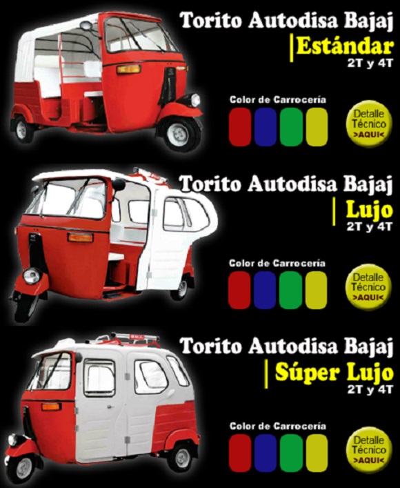 Los motocarros se denominan "Toritos" tanto en versiones moto taxi para transporte de pasajeros (2) con tres modelos: "Estándar", "Lujo" y "Súper Lujo" y, como motocarros para transporte de mercancía, en ambos con transmisión directa por eje con diferencial y paliers en las ruedas traseras
