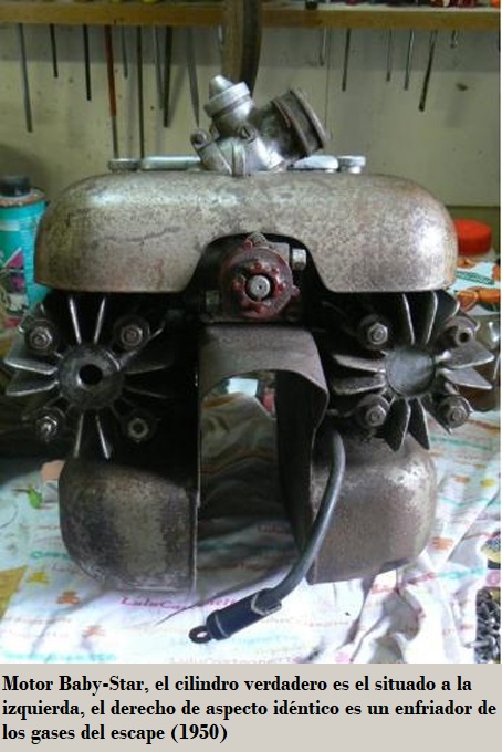 Lo más característico de este motor fue su aspecto, que a primera vista parecía un bicilíndrico horizontal, pero el situado en el lado izquierdo no era más que el mecanismo de enfriamiento del tubo de escape.