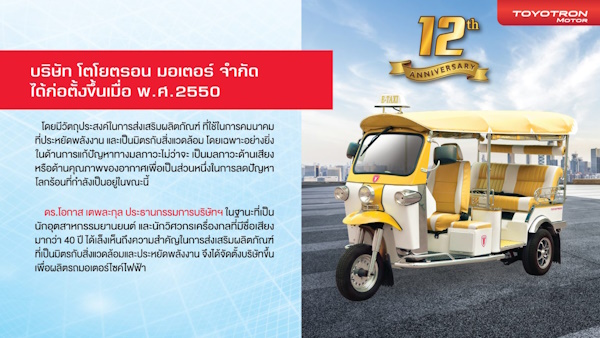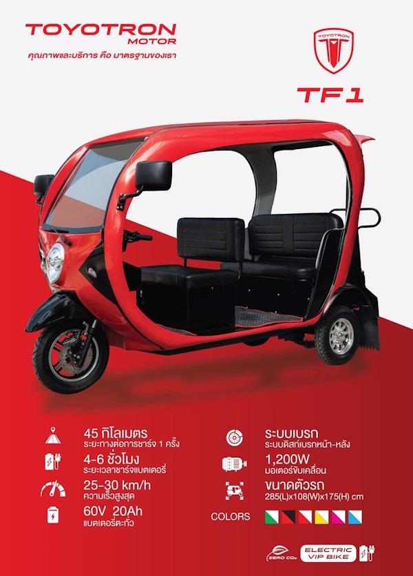 La firma “Toyotron Motor Co.”, con sede en el 6/4 Soi Rarm Intra 82, Min Buri, Bangkok, creada en 2007 por Okas Tepalagul - industrial que lleva casi tres décadas en el sector automovilístico tailandés – dedicándose a la producción de vehículos de 2, 3 y 4 ruedas con motores eléctricos.