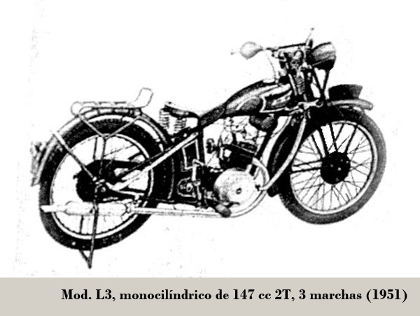 • Mod. L3: motocicleta monocilíndrica de 147 cc 2T, caja de cambios pre-unit de 3 velocidades, bastidor simple cuna, suspensión D/T horquilla de paralelogramos / rígida, ruedas D/T 3.00 x 26", frenos de tambor lateral D/T, alcanzando una velocidad máxima de 70 km/h