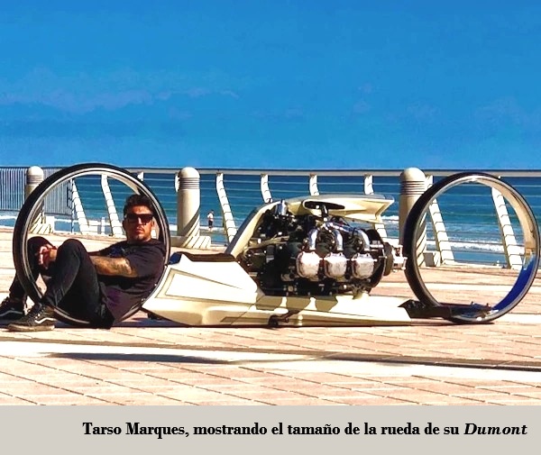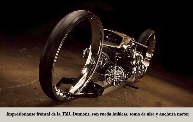 El impresionante aspecto de la TMC Dumont, una moto única en el mundo, viene marcado por dos características principales. Lo primero que salta a la vista son sus ruedas, de casi un metro y medio de diámetro (36 pulgadas), sin cámara y sin bujes, que van fijadas sutilmente por su parte inferior -de forma que parece que floten- a una carrocería que supone casi una anécdota y que no es más que la espina dorsal sobre la que se sustentan el asiento para el piloto y un enorme motor. Este último es la segunda de sus principales y disparatadas características, al tratarse de un propulsor que usaba la casa Rolls-Royce en los años sesenta en aviones como el Cessna 170/172.