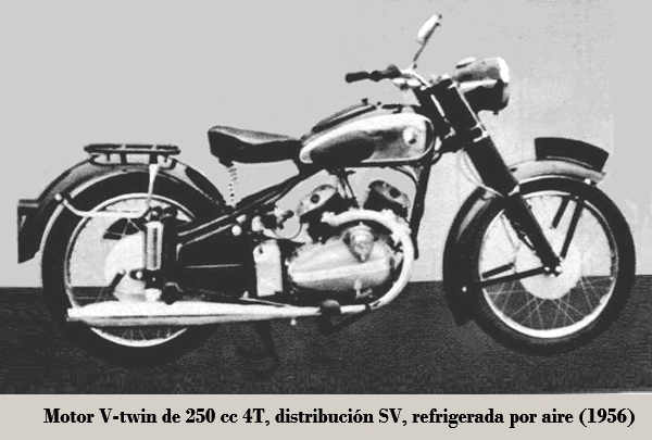 En 1952, lanzó al mercado sus primeras motocicletas de 4T con distribución sv, en versiones monocilíndricas y V-twin, ambas de 250 cc, distribución sv, kick starter, carbrador único, equipadas con suspensión trasera basada en émbolos, mientras que la delantera era distinta según fuera su cilindrada; así las monocilíndricas montaban un horquilla leading link tipo Earles mientras que la bicilíndricas montan horquilla telescópica estándar; todas ellas con motor monobloque, frenos de tambor D/T...