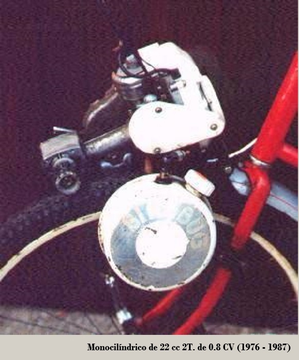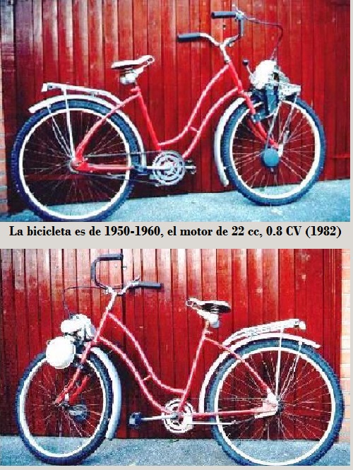 En este caso el motor utilizado en las bicicletas era de 22 cc, de 0.8 CV, montado sobre la rueda delantera, con transmisión a fricción.