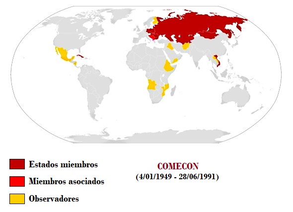 Fundada el 4 de enero de 1949, fue una organización de cooperación económica formada en torno a la URSS por diversos países comunistas cuyos objetivos eran el fomento de las relaciones comerciales entre los estados miembros, en un intento de contrarrestar a los organismos económicos internacionales de economía capitalista, así como presentar una alternativa al denominado Plan Marshall desarrollado por los Estados Unidos para la reorganización de la economía europea tras la II Guerra Mundial, y equivalente también a la Comunidad Económica Europea, aunque en un ámbito geográfico mayor.