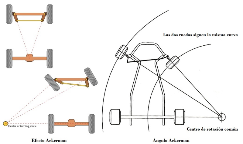 Ante todo una descripción sencilla, al girar las ruedas de un vehículo, por ejemplo hacia la posición total hacia la derecha, el ángulo que ha girado la rueda derecha (interior) es mayor que el de la izquierda (exterior) y viceversa. Ese es el efecto Ackerman