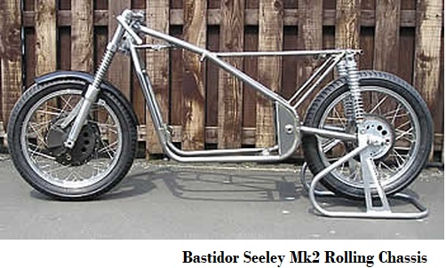 Bastidor doble cuna Seeley Mk2 y basculante con rodamientos de agujas- Amortiguadores Hagon. Horquillas Seeley / Manx cortas. Guardabarros delantero de carbono negro. Freno delantero Fontana de magnesio ø210 mm- Llantas de aleación D/T WM2 / WM3 ambas de 18". Neumáticos Avon D/T AM22