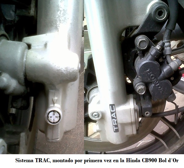 TRAC (Torque Reactive Anti-dive Control): desarrollado por Honda, este es un sistema mecánico simple que está completamente contenido en la suspensión delantera. La pinza del freno delantero está montada sobre una bisagra y utiliza el par creado en la acción de frenado para operar una válvula en la horquilla, que inhibe el flujo de aceite durante el frenado. Este sistema se instaló en varias motocicletas; la primera fue la CB900 Bol d´Or, pero sobre todo en la serie Goldwing desde 1983 hasta 2000, Pacific Coast , CB1100F , CB1000C y VFR750F...