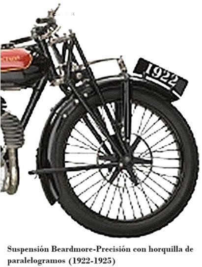 Patentada por la firma Beardmore-Precisión, apareciendo la primera versión en 1921 en una horquilla rígida simple, y la segunda en 1922, en un horquilla de paralelogramos...