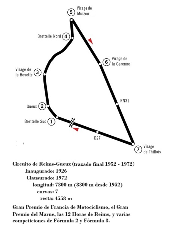 Originalmente, el trazado de Reims-Gueux se componía de las carreteras RN31, CD26 y CD27 que conectaban las localidades de Thillois y Gueux y era de 7.3 km. En 1952, el recorrido se modificó totalmente: se dejó de pasar por el pueblo de Gueux y se aumentó la extensión a 8,3 km. Ya que las carreteras eran casi rectas, se alcanzaban altísimas velocidades máximas, lo que llevó a los organizadores a talar árboles y demoler casas para mejorar las zonas de escape.