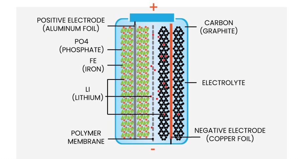 La batería LFP (Lithium Ferrum Phosphate, litio-ferrofosfato o LiFePO₄) es una variante de la batería de litio convencional donde este material se sustituye en su mayoría por láminas de fosfatos de hierro. Estas láminas se concentran en el polo positivo o cátodo.