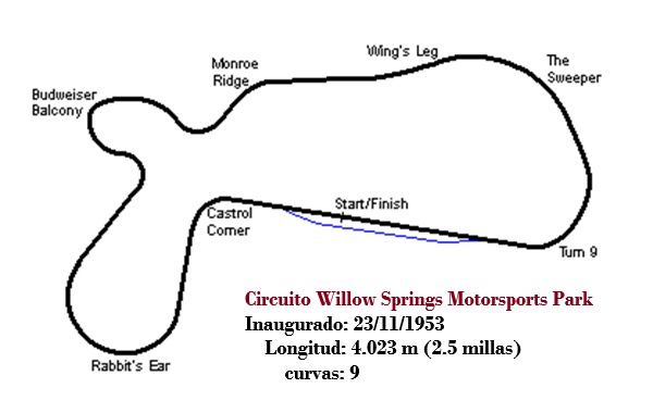 El Willow Springs International Motorsports Park (comúnmente conocido como Willow Springs ) se encuentra en Willow Springs, cerca de Rosamond , California, a unos 130 km al norte de Los Ángeles. Es el circuito permanente más antiguo de Estados Unidos