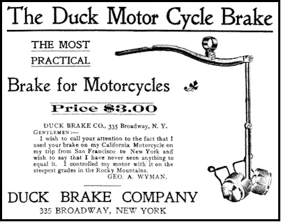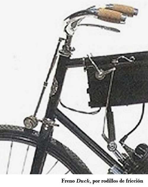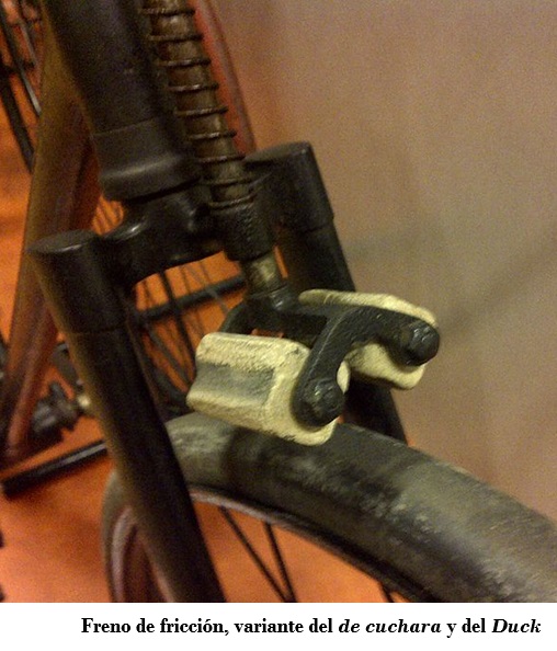 Primitivo freno delantero, inventado y patentado por la Duck Brake Co., en 1897.