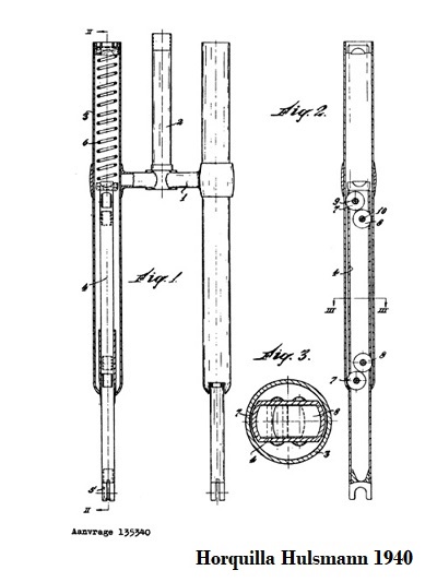 Los primeros motocicletas Hulsmann fueron equipados con esta horquilla telescópica, pero luego se abandonó, dado que no cumplían bien su función las abandonaron y montaron horquillas telescópicas con resortes de acero y casquillos deslizantes con amortiguadores de aceite.
