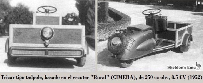 Basándose en sus propios escúteres, modelo Rural, (ver CIMERA), fabricó pequeños tricars tipo tadpole - que no triciclos por montar volante de dirección en vez de manillar - equipados con motor monocilíndrico de 250 cc 4T con distribución ohv de 8.5 CV / 4 600 rpm, capaz de alcanzar los 60 km/h.