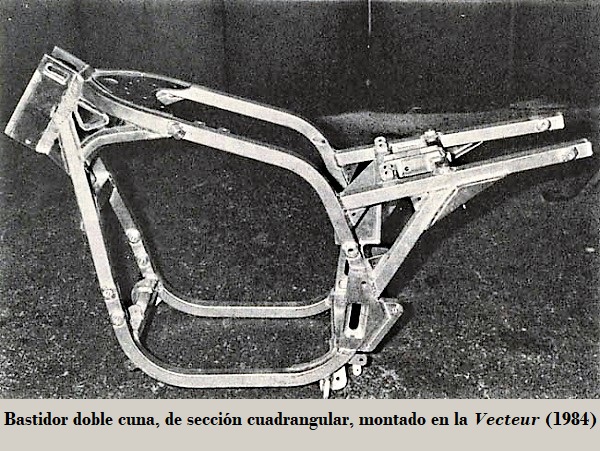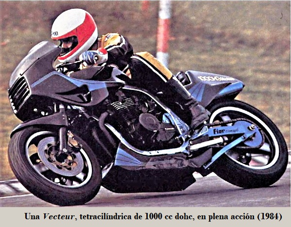 • Vecteur, primer prototipo: motor Kawasaki tetracilíndrico transversal de 1000 cc dohc, 85 CV refrigerado por aire / aceite, 4 carburadores, suspensión D/T horquilla telescópica / basculante con monoshock, bastidor doble cuna de aluminio de sección cuadrangular (diseñado por Claude FIOR), frenos de disco Brembo D/T (2) / (1) ambos con simple pistón. 1984
