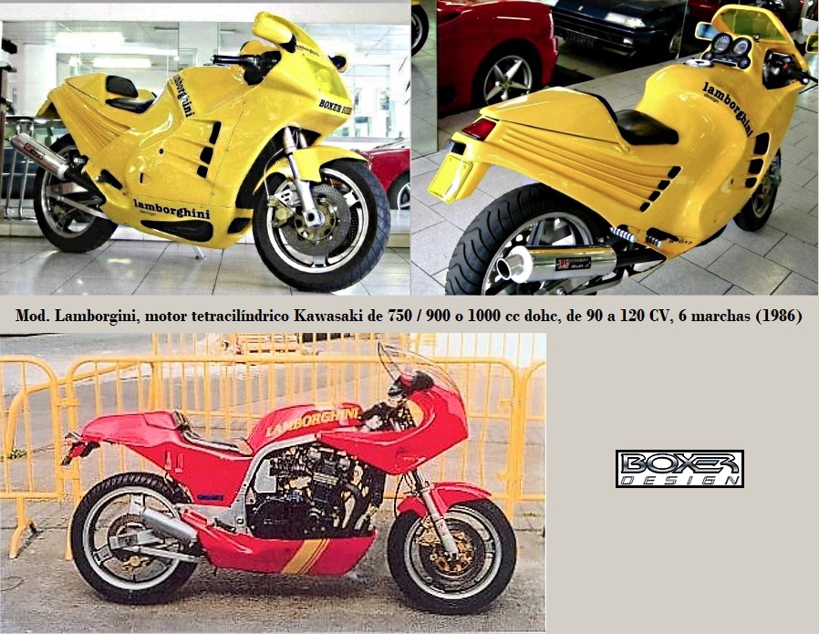• Lamborghini ²: motor Kawasaki tetracilíndrico de 750 / 900 o 1000 cc. de 90 a 120 CV, 6 marchas bastidor diseñado por Claude Fior, amortiguadores Fournales, escapes Devil / Gotti, pinzas de freno Brembo chapadas en oro (en realidad chapadas de "cadmio"), velocidad máxima 258 km/h y 158 kg. Se aceptó una lista de pedidos de 50 unidades, y en 1986 se inició la producción en los talleres Boxer Bikes, siendo adquiridas, en su mayoría, por propietarios de automóviles Lamborgini...
