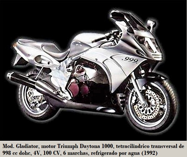 • Gladiator: motor Triumph Daytona 1000, tetracilíndrico transversal de 998 cc dohc 4V, 100 CV / 9 800 rpm, 6 marchas, compresión 11.0:1, refrigerado por agua, compresión 11.0:1, encendido CDI, arranque eléctrico, 4 carburadores Mikuni ø 36 mm, suspensión D/T horquilla telescópica / basculante con monoshock, frenos de disco D/T (2) / (1), neumáticos D/T 120 - 70-17" / 160 - 60-18". transmisión final mediante cadena, velocidad máxima 239 km/h y 268 kg. 1992