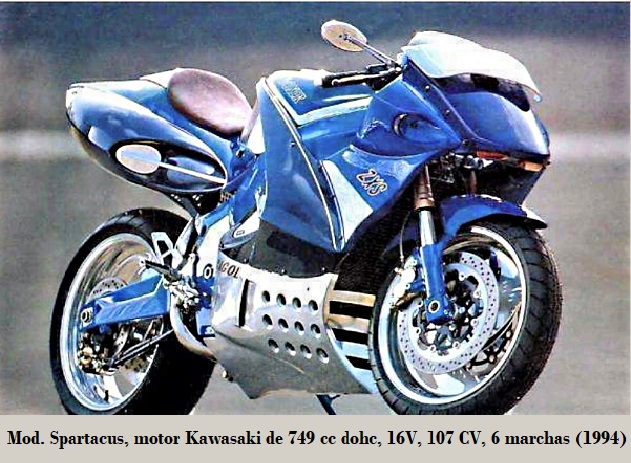 • Spartacus: motor Kawasaki tetracilíndrico de 749 cc dohc, 16V, 107 CV / 10 500 rpm, 6 marchas, refrigerado por agua, compresión 10.8:1, arranque eléctrico, encendido CDI, 4 carburadores Keihin ø 36 mm, bastidor Deltabox, monoshock trasero, batalla 1440 mm, transmisión final mediante cadena. 1994