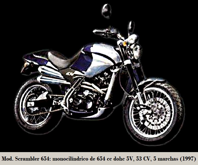 • Scrambler 654: monocilíndrico de 654 cc dohc 5V, 53 CV / 7 000 rpm, 5 marchas, refrigerada por agua, compresión 9.1:1, encendido CDI, arranque eléctrico, carburador Mikuni BST33, suspensión D/T horquilla invertida ø 41 mm / basculante con monoshock Fournales, frenos de disco D/T ø 320 (4 pistones) / ø 220 mm (2 pistones), neumáticos D/T 110 - 80-18" / 150 - 70-17", transmisión final mediante cadena, velocidad máxima 177 km/h, tanque 16 L y 162 kg. 1996