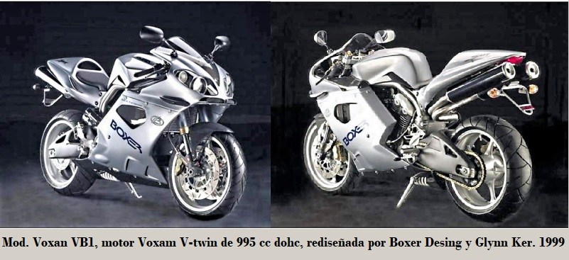 • Voxan VB1 Sport: basada en la Voxan V-twin de 995 cc a 45º dohc, {discos de freno Brembo} D/T (2) ø 320 (4 pistones) / ø 245 mm (2 pistones), suspensiones D/T horquilla invertida Paioli ø 41 mm / basculante con monoshock. sobre la que Boxer Design junto con el diseñador Glynn Kerr, la presentaron en el Salón de Paris en 1999. La primera serie, limitada a 31 unidades, se fabricaron a partir de 2001